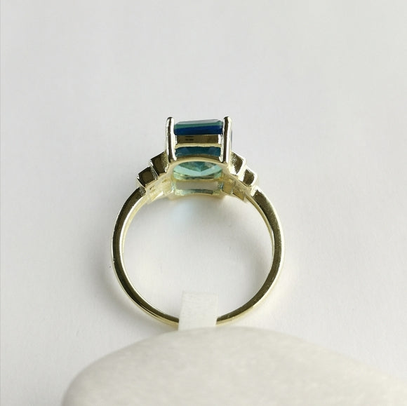 This unique ring features a captivating blue green quartz gemstone set in sterling silver with 14k gold overlay. It is a rectangular, emerald cut peacock quartz. CZ accents on either side of the main stone.
