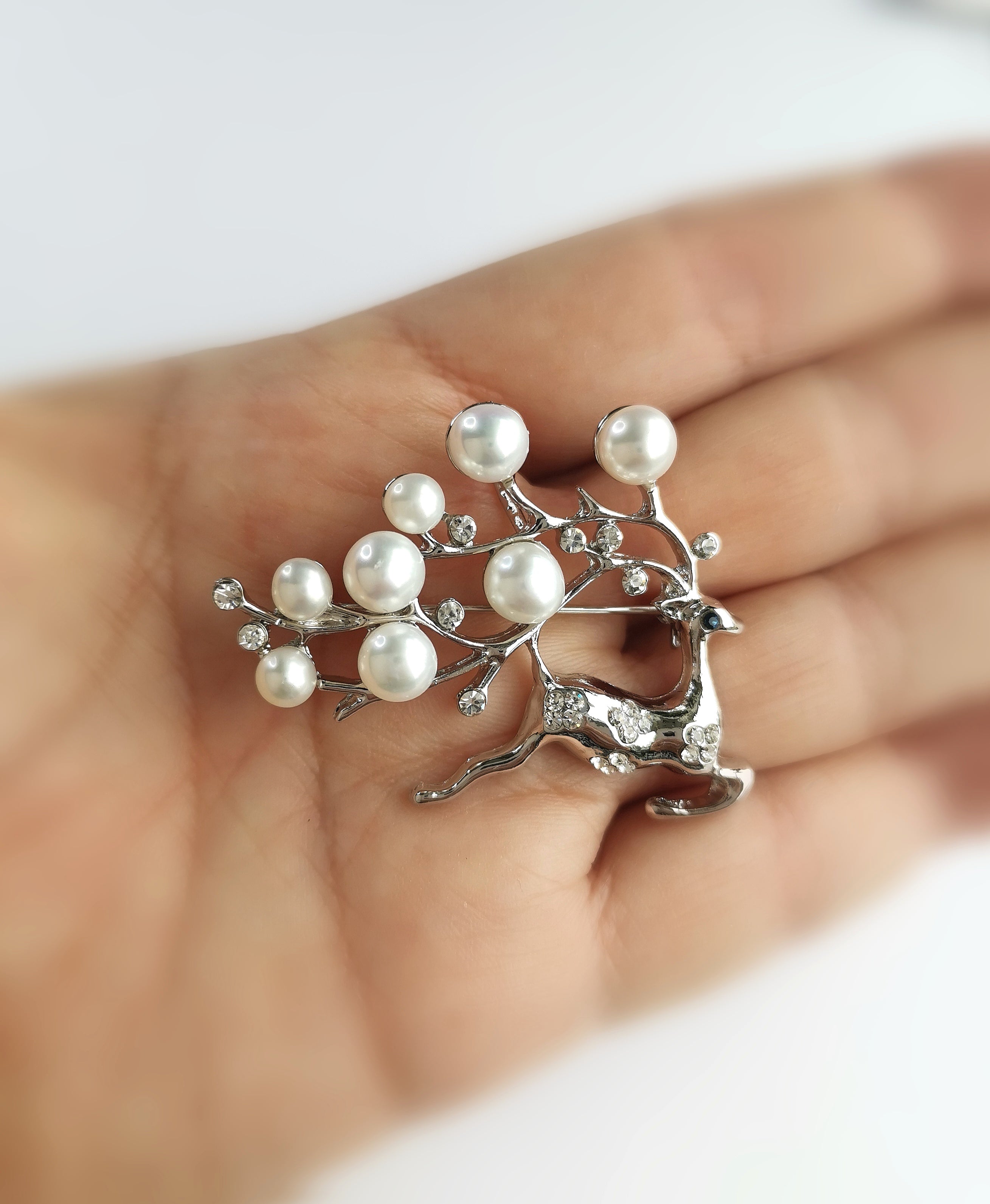 Christmas Reindeer Brooch with Crystals and Freshwater White Pearls.