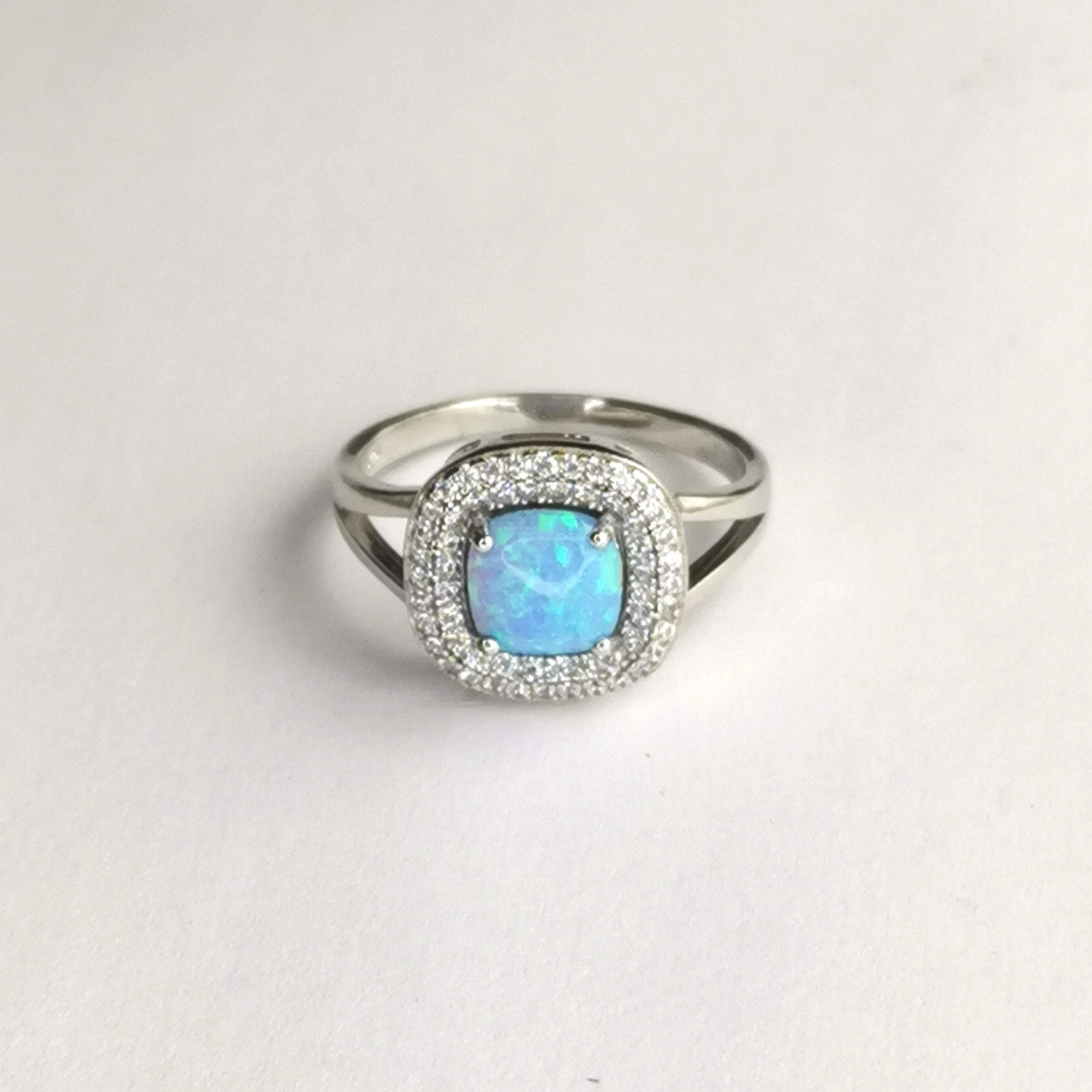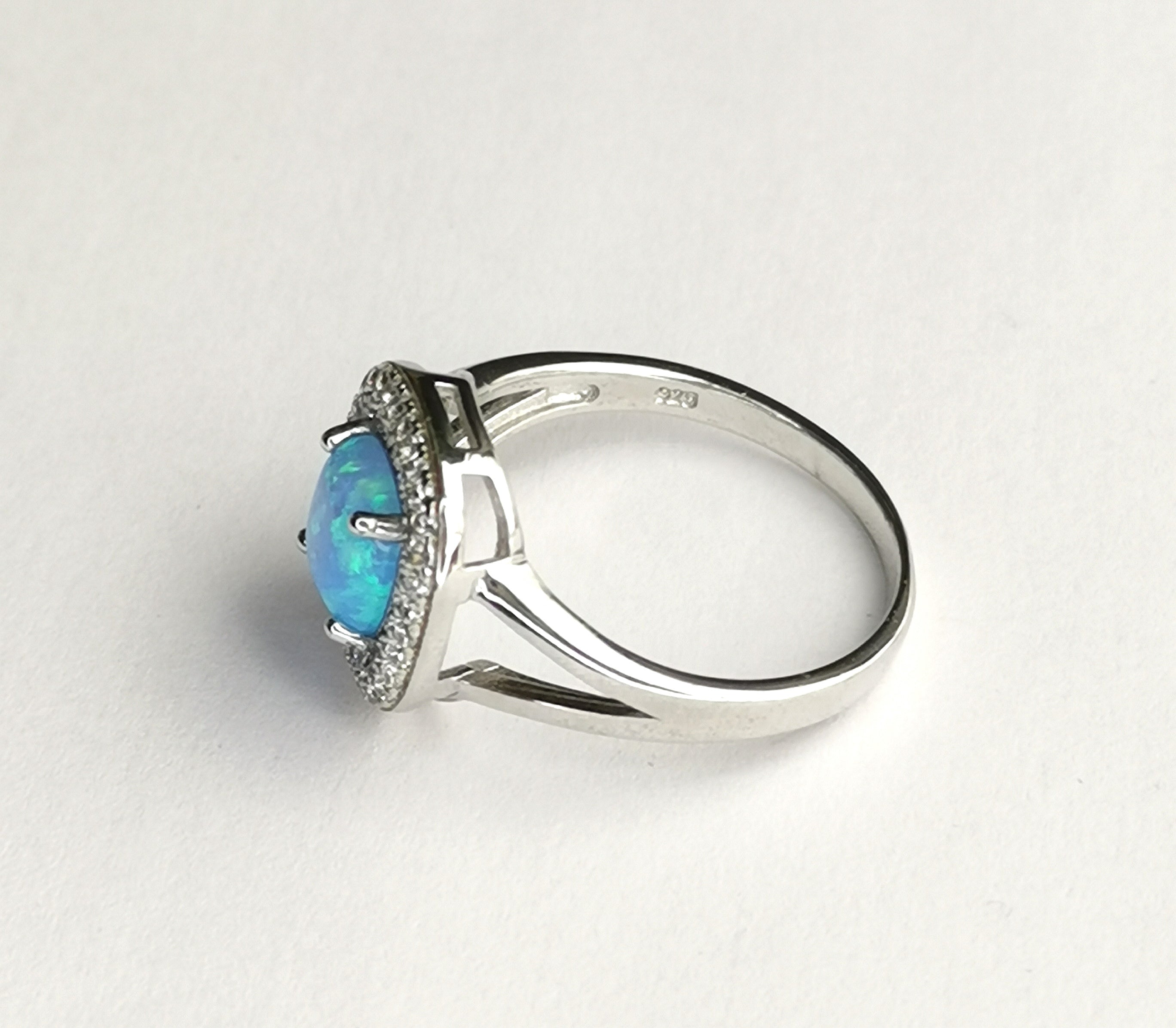 Sparkle and shine with this ring. A billiantly coloured Turquoise blue Opal, with a surround of pave CZ.
