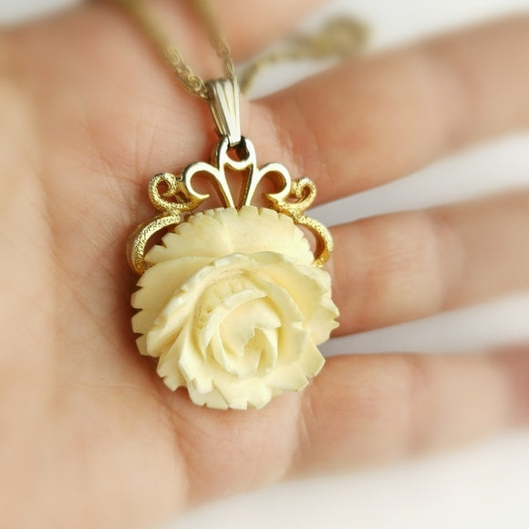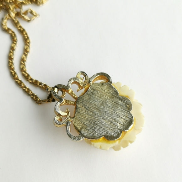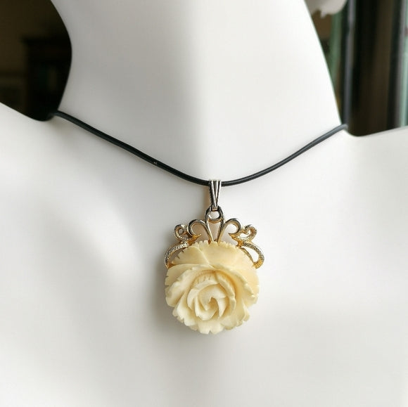 Vintage mid-century carved resin rose pendant necklace from the 1950s.